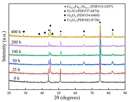 The obtained XRD spectra of the 316L SS specimen prior to and following corrosion in molten NaCl-KCl salts at a temperature of 700 °C for various time durations are shown in Figure 8. The Cr0.19Fe0.7Ni0.11 phase (PDF card 33-0397, face-centered cubic structure, a = 3.5911 Å) was the main crystalline phase for the 316L SS specimen before corrosion and was also detected after corrosion. Compared with the diffraction peak intensity of the Cr0.19Fe0.7Ni0.11 phase for the 316L SS sample prior to corrosion, the diffraction peak intensity for the 316L SS sample following corrosion was weaker, which could be linked to the formation and coverage of corrosive products. New peaks of 2θ at around 44.65°, 64.98°, and 82.28° were observed on the surface of the corroded 316L SS specimens, which were consistent with the characteristic signal of the Fe-Ni phase (PDF card 37-0474, body-centered cubic structure, a = 2.8681 Å). In addition to the Cr0.19Fe0.7Ni0.11 and Fe-Ni phases, the diffraction peak of Cr2O3 (PDF card 85-0730) was also observed after immersion for 100 h. When the 316L SS specimen was immersed in the NaCl-KCl molten salt for 400 h, Fe2O3 (PDF card 54-0489) was observed in the XRD pattern. The obtained XRD results agreed with the thermodynamic calculations of the oxides and elemental analysis of the corroded samples.