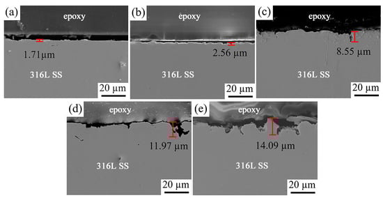 The obtained cross-sectional SEM images of the 316L SS specimens immersed in molten NaCl-KCl salt at a temperature equal to 700 °C for varying time durations: (a) 25 h, (b) 50 h, (c) 100 h, (d) 200 h, and (e) 400 h.