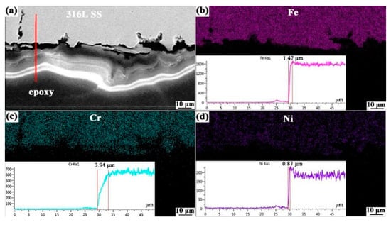 The cross-sectional SEM-EDS mappings of the primary elements for the 316L SS specimen immersed in molten NaCl-KCl at 700 °C for 400 h are shown in Figure 10. It was clearly observed that the specimen experienced Cr depletion, which predominantly occurred along the grain boundaries (GBs). In addition, Fe depletion was also detected at the GBs. To assess the compatibility of the 316L SS specimen with molten NaCl-KCl salt, the depletion depths of Cr, Ni, and Fe were measured, as shown in the insets in Figure 10b–d. The depletion depths were found to be 1.47 μm for Fe, 3.94 μm for Cr, and 0.87 μm for Ni. These results further confirm that the corrosion of the 316L SS specimen in NaCl-KCl molten salt was primarily due to selective Cr dissolution, accompanied by the dissolution of small amounts of Fe and Ni. The Cr depletion depth can be used as an indicator of intergranular corrosion penetration.