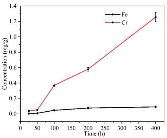 The variation in concentration values of Cr and Fe in the molten NaCl-KCl salt with immersion time is depicted in Figure 11. The figure clearly shows an increase in the concentration of both elements with an increase in immersion time. From 50 h to 100 h of immersion, there was a sharp increase in the Fe and Cr concentrations, indicating a significant loss of Fe and Cr from the 316L SS specimens. Subsequently, the concentration of Fe within the molten salt slowly increased as the immersion time was extended from 100 to 400 h, whereas the concentration of Cr increased almost linearly with immersion time. Since the concentration values of Ni, Cr, Mo, and Fe within the 316L SS specimen were much higher than those in the NaCl-KCl molten salt, the concentration difference resulted in the diffusion of these elements from the 316L SS specimen to the molten salt. However, among these elements, Cr was the element that corroded most easily, whether in molten chloride or fluoride salts, because Cr exhibits the fastest diffusion rate and the highest chemical activity [33]. Hence, the dissolution and loss of Cr was the most serious, followed by that of Fe. It should be pointed out that the amount of dissolution and loss of Ni and Mo from the 316L SS specimen was so small that the Ni and Mo concentrations in the molten salt could not be determined using ICP-OES.