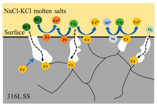 Based on the above analysis, schematic diagrams illustrating the corrosion mechanism of the 316L SS alloy in molten NaCl-KCl salt are presented in Figure 12. The selective dissolution of Cr was identified as the primary cause of the corrosion of 316L SS alloys in molten chloride salts. Specifically, Cr atoms located on the surface and along the grain boundaries (GBs) preferentially dissolved. Consequently, the diffusion rate of Cr atoms played a crucial role in the corrosion behavior of the 316L SS alloy. Smith et al. observed that the diffusion rate of Cr atoms along the GBs in 316L SS was faster than that in the lattice [46]. The GBs of the 316L SS alloy preferentially corroded in NaCl-KCl molten salt, resulting in intergranular corrosion. Additionally, the δ phase and M23C6 phase (as shown in Figure 4) within the 316L SS alloy might dissolve in the NaCl-KCl molten salt, causing pitting corrosion. Corrosion pits can act as stress concentrators, potentially exacerbating the propagation of intergranular corrosion. Moreover, small amounts of Mo content in stainless steels may suppress pitting corrosion [34]. Therefore, both intergranular corrosion and pitting corrosion were observed in the 316L SS alloy within the NaCl-KCl molten salt environment; however, intergranular corrosion was the predominant corrosion mechanism.
