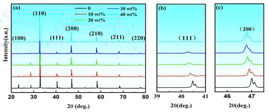The XRD patterns of (1 − x)({0.97[0.985(BNT–BT)–0.015Er]–0.03AlN}–xNN ceramics in the 2θ ranges of (a) 20–80°, (b) 39–41°, and (c) 45.5–47.5°, ceramics at RT are revealed in Figure 1a–c. The development of a full solid solution is confirmed by the observation that all compositions exhibit a characteristic perovskite structure and are devoid of impurity phases. Meanwhile, Figure 1b,c illustrates that the 2θ ranges of 39–41° and 45.5–47.5° are zoomed in. In these regions, the splitting of the (111) peak at around 40.5° and the (200) peak at around 47° revealed that rhombohedral and tetragonal phases coexist in all (1 − x)({0.97[0.985(BNT–BT)–0.015Er]–0.03AlN}–xNN samples, which is a common feature in perovskite materials undergoing phase transitions.