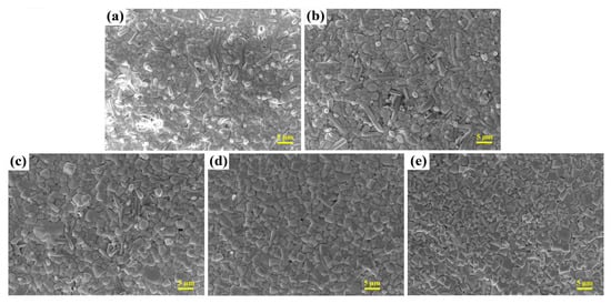 Figure 2a–e reveal the SEM images of the surface microstructure and the mean grain size measurements for all samples. All samples displayed dense microstructure and low porosity. Notably, when the addition of NN is increased to 30 wt%, the originally elongated bar-shaped grains disappear. This phenomenon can be attributed to the substitution of Ti4⁺ with Nb5⁺, which introduces significant lattice distortion since Ti4⁺ and Nb5⁺ have different valence states and ionic radii. The lattice distortion increases internal stress within the grains, reducing grain mobility and suppressing grain growth []. As a result, the elongated bar-shaped grains, which typically form under conditions of higher grain mobility, are no longer sustained and instead transform into smaller, more equiaxed grains. We used NaNo measuring software to estimate the particle size distribution with increasing NN concentration, and the results are displayed in Figure 3. The average particle size reduced from 2.82 μm to 2.14 μm as the NN concentration increased. This reduction in grain size further supports the idea that the introduction of NN suppresses grain growth. The decreased grain size and increased density can result in a rise in the Eb. The correlation between breakdown field strength and grain size can be expressed by the equation below []: