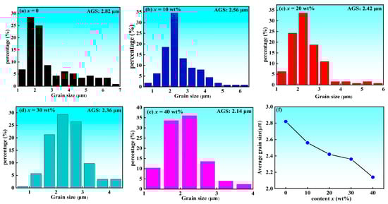 The AGS of (1 − x)({0.97[0.985(BNT–BT)–0.015Er]–0.03AlN}–xNN ceramics for (a–e) x = 0, 10 wt%, 20 wt%, 30 wt%, and 40 wt%. (f) The variation in the AGS.
