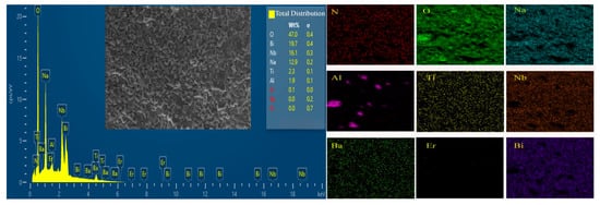 To evaluate the distribution of various elements in the ceramics, energy dispersive spectroscopy (EDS) was applied to conduct an elemental scan of 60 wt% {0.97[0.985(BNT–BT)–0.015Er]–0.03AlN}–40 wt% NN, as presented in Figure 4. The findings indicate that the elements are uniformly distributed within the ceramic grains. This uniform distribution is in line with the results of XRD, which confirm the formation of a homogeneous solid solution. Additionally, the proportions of the various elements closely match the theoretical values, validating the stoichiometric composition of the samples.