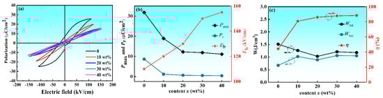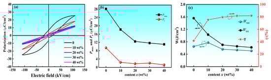 Figure 5a exhibits the P–E loops, (b) the remanent polarization (Pr) and Pmax, and (c) the η, total energy density (Wtot), together with Wrec as a function of x for (1 − x)({0.97[0.985(BNT–BT)–0.015Er]–0.03AlN}–xNN ceramics at RT and 110 kV/cm. Figure 5a demonstrates that the P–E loops become narrower as NN content increases. At x = 0, Pmax reduces from 28.13 μC/cm2 to 11.06 μC/cm2 at x = 40 wt%, while Pr reduces from 9.38 μC/cm2 to 1.22 μC/cm2, as exhibited in Figure 5b. The generation of polar nanoregions (PNRs), along with the disturbance of the long-range ferroelectric order caused by the presence of NNs, may be the cause of this phenomenon. Under the condition of the applied electric field, PNRs can achieve a saturation value of Pmax by polarizing into ferroelectric domains [], while the complete elimination of the random distribution of PNRs by the applied electric field results in a return to a local ergodic relaxor state that minimizes Pr []. Consequently, the creation of PNRs strengthens the characteristics of the ferroelectric relaxor, elongates the P–E loop, and enhances the performance of Wrec.