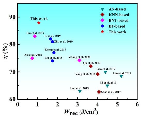 Furthermore, the 70 wt% {0.97[0.985(BNT–BT)–0.015Er]–0.03AlN}–30 wt% NN ceramic exhibits superior Wrec and η values compared to other lead-free energy storage ceramics, as presented in Figure 7. Specifically, AN-based ceramics [,,,] and KNN-based ceramics [,,] achieve high Wrec values but have relatively low η values. Meanwhile, BNT-based [,,] and BF-based ceramics [,,,] exhibit relatively high η values, yet they still fall short of the performance demonstrated by the 70 wt% {0.97[0.985(BNT–BT)–0.015Er]–0.03AlN}–30 wt% NN ceramic. In this work, the 70 wt% {0.97[0.985(BNT–BT)–0.015Er]–0.03AlN}–30 wt% NN ceramic achieves an impressive Wrec of 1.06 J/cm3 and an η of 88%, surpassing the performance of previously documented high-performance BNT-based systems.