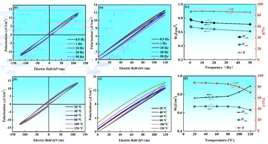 Characterization of the 70 wt% {0.97[0.985(BNT–BT)–0.015Er]–0.03AlN}–30 wt% NN component:(a) P–E loops, (b) unipolar P–E loops, and (c) Wtotc, Wrec, and η at 0.5–50 Hz; (d) P–E loops, (e) unipolar P–E loops, and (f) changes in Wtot, Wrec, and η at 20–120 °C.