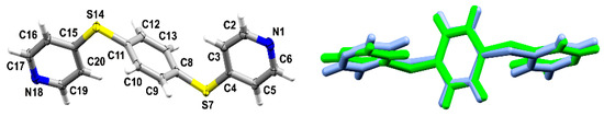 SCXRD revealed that both isolated polymorphs, α and β, crystallize in the same P21/c space group of the monoclinic system. Form α contains one molecule of 1,4-bis(thiopyridine)benzene in the asymmetric unit (Figure 1), unlike form β, which contains half a molecule, with the other half being generated by an inversion center. Interestingly, α shows whole-molecule disorder, with occupancies of the components estimated to have a 93:7 ratio. We have separated both components (major—αa, and minor—αb) and used these in further comparisons.