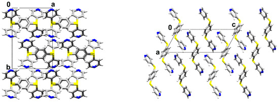 In continuation of our studies on polymorphism taking place in dipodal N-donor ligands containing an aromatic core [12], we isolated polymorphs of 1,4-bis(thiopyridine)benzene (Scheme 1). Interestingly, one of the forms (α) showed whole-molecule disorder, a phenomenon which occurs when a molecule in a crystal can occupy multiple orientations or positions. Depending on the energy of the adapted molecular orientations, we could expect either a 50:50 molecular disorder ratio for the same energy, or differentiation based on the energy gap; for example, the whole-molecule disorder revealed for (1-adamantyl)methyl-1-adamantanecarboxylate shows 95/5 occupancies of the components [13]. One of the most studied systems showing whole-molecule disorder is (C60—Ih) fullerene [14,15]. However, the phenomenon is not encountered so often. Mostly, the two components are related by pseudo two-fold symmetry, as reported, for example, for 2-(2-thien-yl)-1-(2-pyrazin-yl)ethene and 2-(2-thien-yl)-1-(2-quinoxalin-yl)ethene [16], but there are also cases where the components are not related by a symmetry operation, such as for 4,4′-sulfonyl-bis[N-(4-nitro-phenyl-methylene)benzen-amine] [17]. In a very recent paper, whole-molecule disorder was revealed for one out of three molecules in 8-nitrobenzothiazinone [18]. Our studies were elaborated by applying computational methods, as well as via supportive studies on bulk material, such as PXRD and thermal analyses.