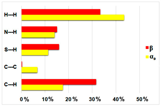 To quantify the contributions of the different contacts, a Hirshfeld analysis was performed, allowing for the generation of fingerprint plots for αa and β and the determination of the relative contributions of intermolecular contacts to the Hirshfeld surface [23]. These indicated that β is clearly dominated by weak hydrogen bonds, whereas αa is dominated by van der Waals forces and further stabilized by weak hydrogen bonding and π-π interactions. The latter are absent in β (Figure 3).