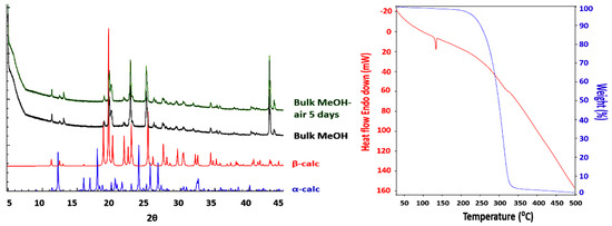 PXRD studies performed on the bulk crystalline material indicated dominancy of the β phase (the powder pattern did not change after leaving the sample exposed to air for 5 days). It seems that α converts rather quickly to β (the crystal measured was taken from the solution). The bulk sample did not undergo any transitions in a temperature range from room temperature up to the melting point, as shown on the DTA curve (Figure 4).