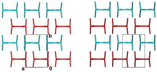 Comparison of the packing modes of the ligand molecules in αa and αb (Figure 5) indicates that the difference between the major and the minor component lies mostly in the mutual position of the AB layers formed by the ligands parallel to the ac plane. This is also evident from the results generated by the program XPack, which was used to estimate the similarity of the molecular arrangements, and is especially handy in the case of isostructural systems or polymorphs. It indicated the formation of 2D supramolecular constructs (meaning the presence of matching layers that show differences in the way they are stacked), and calculated a dissimilarity index equal to 1.7, which indicates high similarity between both components. For clarification, this value is in the range of those obtained upon replacement of small substituents in crystal structures such as Cl with Br (x = 1) and Me with CF3 (x = 2.8) [36]. The program Mercury also estimated a high similarity between αa and αb, showing overlap of 8 molecules out of 15, with an RMS deviation of 0.063 Å (the standard settings were used, selecting the molecules with 20% tolerance for bonds and angles).