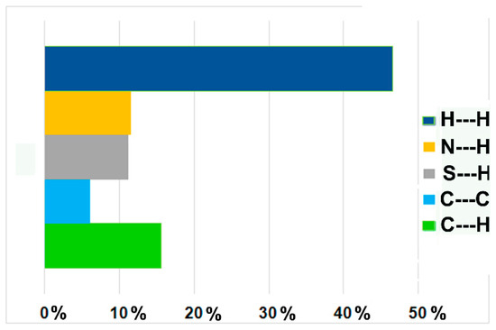 Both components (major αa and minor αb) show different sets of intermolecular interactions. This is obviously a rough estimate for αb, as it concerns a component with a very low input in the crystal formed. Hirshfeld analyses performed with CrystalExplorer indicated that the packing of αb is dominated by van der Waals interactions to a higher extent than is the case for αa, and that it shows a lower input of H bonding (Figure 6). This observation is supported by calculated enrichment ratios [37], indicating dominance of C-H---N interactions in αa, with a value of 1.47, versus 1.11 in αb (see also Table 4; the same labeling was applied for both components), and slight dominance of H---H contacts in αb (1.07 versus 1.03).
