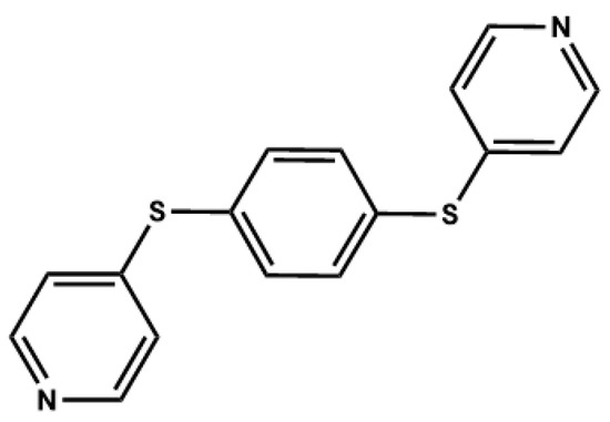 All commercially available chemicals and solvents were of reagent grade, and were used without further purification. The new ligand 1,4-bis(thiopyridine)benzene was synthesized via a procedure adapted from the synthesis of 2-benzenesulfonyl-pyridine [19]. A 25 mL flask was charged with 4-bromopyridine hydrochloride (1.45 g, 7.5 mmol), 1,4-benzenedithiol (0.5 g, 3.5 mmol), and DMF (5 mL). K2CO3 (2.21 g, 16 mmol) was added, and the mixture was heated to 110 °C and stirred for 24 h. The resulting mixture was extracted using water and ethyl acetate. The organic layer was washed with water, dried over MgSO4, filtered, and concentrated to give the pure product as a yellow solid. Yield = 88%. 1H NMR (CDCl3, 700 MHz): δ = 7.15 (d, 4H), 7.62 (t, 4H), 8.47 (s, 4H) ppm; 13C NMR (CDCl3, 100 MHz): δ = 149.8, 148.5, 135.3, 132.1, 121.7 ppm. MP = 133–135 °C.