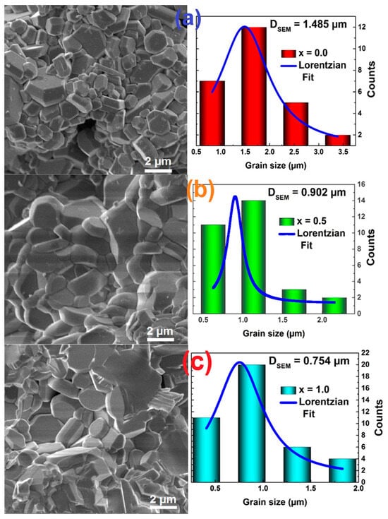 SEM images of the Ba1−xSrxFe12O19 M-type hexaferrites: (a) x = 0.0, (b) 0.5, and (c) 1.0.