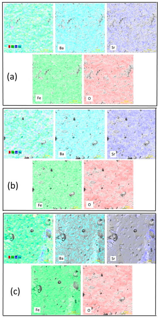Element mapping of the Ba1−xSrxFe12O19 samples: (a) x = 0.0, (b) x = 0.5, and (c) x = 1.0, determined by EDS.