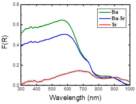Solid state diffuse reflectance spectra of the samples, as indicated: Ba1−xSrxFe12O19 (x = 0.0, 0.5, and 1.0), after Kubelka–Munk function, F(R), transformation.
