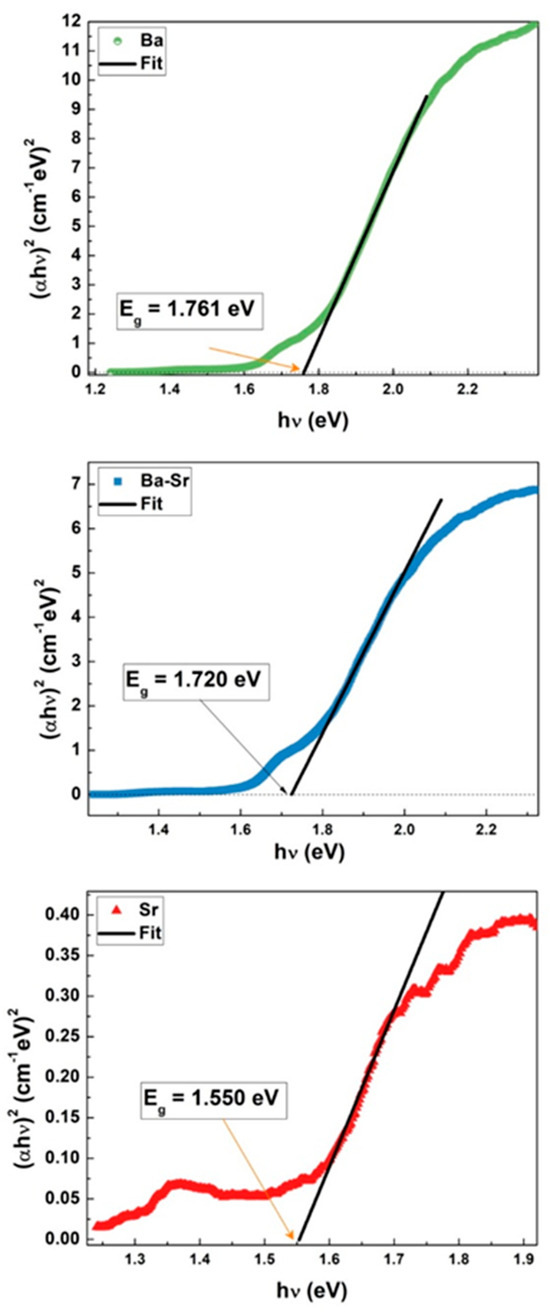 Tauc plots for indirect band gap of Ba1−xSrxFe12O19 (x = 0.0, 0.5, and 1.0) samples.