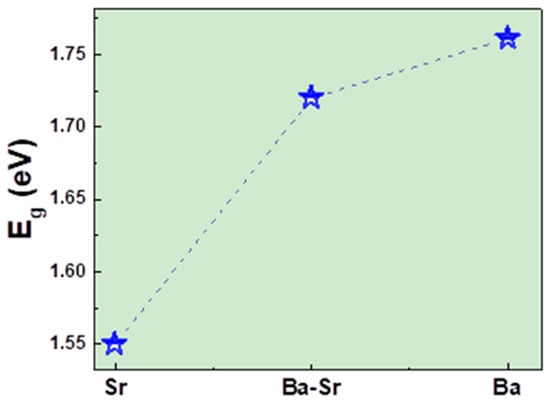 Size, metal substitution ratio, geometry, and synthesis method differences might lead to different optical band gap energies [36,37]. The results obtained for Eg are plotted in Figure 7. From those values, the semiconductor nature of the produced compounds can be inferred [35], and one can see that Eg decreases with the increase of Sr content.