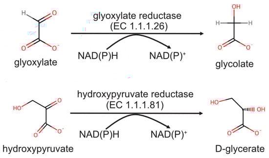 GRHPR is an enzyme belonging to the D-2-hydroxy-acid dehydrogenase superfamily and is classified as an NAD(P)H-dependent dehydrogenase [3,4]. This enzyme plays a crucial role in catalyzing two important reactions: the reduction of glyoxylate to glycolate (EC 1.1.1.26) and the reduction of hydroxypyruvate to D-glycerate (EC 1.1.1.81) (Figure 1) [5]. These reactions are significant because they generate the gluconeogenic precursor D-glycerate from hydroxypyruvate and eliminate the highly reactive oxalate precursor glyoxylate from the cytosol. Under physiological conditions, this enzyme exhibits a preference for catalyzing reactions in a specific direction, utilizing either NAD(P)H or NAD(P)+ as the preferred cofactor. In plants, GRHPR assists in detoxifying plant cells by reducing glyoxylate levels [6].
