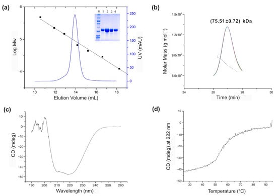 The measurements were performed using an AKTA Basic System (Cytiva, Wilmington, DE, USA) connected to a mini DAWN TREOS (Wyatt Technology, Santa Barbara, CA, USA). Superdex-200 HR 10/300 GL (Cytiva, Wilmington, DE, USA) was used with a buffer of 20 mM Tris-HCl, 200 mM NaCl, pH 8.0, and a flow rate of 0.5 mL/min. The protein concentration was 5.0 mg/mL. The standard mix was composed of seven proteins: aprotinin from bovine lung (A3886; Mw 6.5 kDa; Sigma-Aldrich, St. Louis, MO, USA), cytochrome C from equine heart (C7150; Mw 12.4 kDa; Sigma-Aldrich, St. Louis, MO, USA), carbonic anhydrase from bovine erythrocytes (C7025; Mw 29 kDa; Sigma-Aldrich, St. Louis, MO, USA), ovalbumin from chicken egg white (A8531; Mw 43 kDa; Sigma-Aldrich, St. Louis, MO, USA), alcohol dehydrogenase from yeast (, A8656; Mw 150 kDa; Sigma-Aldrich, St. Louis, MO, USA), β-amylase from sweet potato (A8781; Mw 200 kDa; Sigma-Aldrich, St. Louis, MO, USA), and apoferritin from horse spleen (A3630; Mw 443 kDa; Sigma-Aldrich, St. Louis, MO, USA).