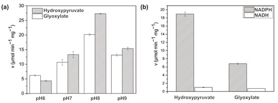 In addition, we measured the specific activity of each substrate at four different pH values (Figure 3a). BsGRHPR exhibited maximum activity at pH 8.0 with both substrates. The specific activities of hydroxypyruvate and glyoxylate were 27.3 μmol min−1 mg−1 and 20.2 μmol min−1 mg−1, respectively. We also investigated the cofactor-dependent enzyme activity (Figure 3b). The specific activity of NADPH was higher than that of NADH in this study. These results are consistent with those of human GRHPR but differ from those of archaeal GRHPR [3,7,8,9].