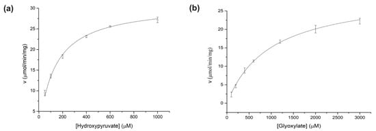 Michaelis–Menten kinetic analysis. The data were fitted to the Michaelis–Menten equation to calculate Vmax and Km values. Triplicate assays were performed for each point. The bar represents the standard deviation and the circle represents the average. (a) Enzyme kinetics of hydroxypyruvate. (b) Enzyme kinetics of glyoxylate.