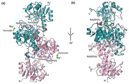Overview of BsGRHPR in complex with both the cofactor and formate. The dimer is shown in ribbon diagrams with different colors for each monomer. The cofactor (NADP(H)) and formate are shown in stick model representations, and the magnesium ion is represented by a green ball. (a) Overview and (b) rotated view of BsGRHPR in complex with both the cofactor and formate.