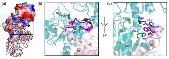 A dimer model of the crystal structure was generated using crystallographic operation. The PISA server analysis revealed an interface area of 2538 Å2. The α-helix (α6) and 310-helix (η1) primarily contribute to dimer formation (Figure 6a) [14]. Trp132 was inserted into the hydrophobic pocket formed by Pro269 and Pro286 in other subunits, whereas Glu137 formed a salt bridge with Arg296 in another subunit (Figure 6b,c). The distances between the carboxylate oxygens of Glu137 and the guanidinium group of Arg296 are 3.2 Å and 2.8 Å, respectively. W132, Pro269, Pro286, and Arg296 are highly conserved among homologs (Figure 7).