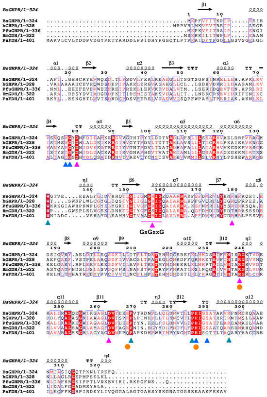 Multiple sequence alignment of BsGRHPR. The sequences of homologs were used for multiple sequence alignment using the web interface of Clustal Omega (https://www.ebi.ac.uk/jdispatcher/msa/clustalo, accessed on 17 March 2025; v1.2.4). The diagrams for secondary structure generated using ESPrint/ENDscript (https://endscript.ibcp.fr, accessed on 17 March 2025) are represented based on the crystal structures in this study, were [15]. The synonyms of the homologs are shown as follows: BsGRHPR, Bacillus subtilis glyoxylate/hydroxypyruvate reductase, UniProt A0AAP1E3x5; hGRHPR, human glyoxylate/hydroxypyruvate reductase, UniProt Q9UBQ7; PfuGRHPR, Pyrococcus furiosus glyoxylate reductase, UniProt Q9U33Y2; HmGDH, Hyphomicrobium methylovorum glycerate dehydrogenase, UniProt P36234; PsFDH, Pseudomonas sp. Formate dehydrogenase, UniProt P33160. The marked triangles represent the characteristic motifs designated in this study as follows: magenta, cofactor-binding motif; teal, dimerization motif; blue, substrate-binding motif. The catalytic triad residues are denoted by orange circles.
