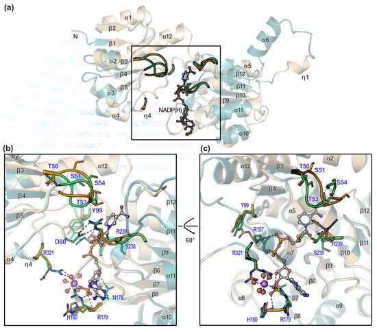 The superposition of the apo- and cofactor-bound forms explains the conformational changes in the enzyme. The overall fold did not change, as reflected in the rmsd value of 0.126, although the adjacent loops around the cofactor showed structural differences (Figure 8a). While the cofactor binds to the pocket, Arg239 is repelled and forms two salt bridges with Asp80 at a distance of 2.9 Å (Figure 8b). The most obvious change was observed for Arg157, which binds to the pyrophosphate of the cofactor (Figure 8c). Arg179 is also important for cofactor binding because it recognizes the phosphate of the cofactor (Figure 8c). The amide in the main chain of His180 interacts with the phosphate of the cofactor at a distance of 3.2 Å. In the substrate-binding domain, the loop between β3 and α3 (residues 50–55) shifts towards the cofactor. This shift allows for better accommodation of the cofactor within the binding pocket. The movement of the loop also creates additional space for substrate binding, potentially enhancing catalytic efficiency. Furthermore, the repositioning of these residues may contribute to the stabilization of the enzyme–substrate complex during the reaction. The distance between Gly52 in the two structures was 5.5 Å, and the distance between Ser51 in the two structures was 2.8 Å. This observation suggests that the active site moves as a rigid body to accommodate the cofactor (Figure 8c).