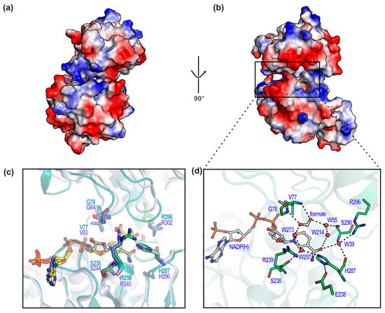 Structural details of active sites. (a,b) The surface of the monomer is colored according to the electrostatic potential from red (−73.2 kT/e, negatively charged) to blue (+73.2 kT/e, positively charged). (c) Structural alignment of BsGRHPR and hGRHPR (PDB ID: 2GCG). The structures were aligned using PyMOL, with a resulting root mean square deviation of 0.82. BsGRHPR is represented as teal-colored cartoon diagrams and gray stick models (cofactor and formate), and hGRHPR is represented as light-purple-colored cartoon diagrams and yellow stick models (cofactor and D-glycerate). (d) Zoomed-in view of the formate-binding site. Water molecules are represented by red balls.