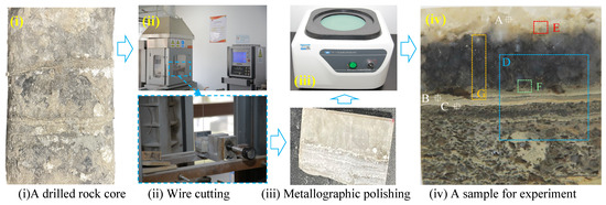 A core sample of typical bedded rock salt, characterized by two distinct interlayers [36], was selected for specimen preparation, as illustrated in Figure 1. A wire-cutting apparatus equipped with a 0.5 mm diameter diamond-coated wire was used to ensure precise sample fabrication. To minimize thermal damage during cutting, a controlled cutting speed of 10 m/min was maintained. The prepared thin section, measuring approximately 30 mm in length, 30 mm in width, and 5 mm in thickness, was subsequently polished using a metallographic polishing machine, yielding a sample suitable for both SEM analysis and creep deformation experiments.