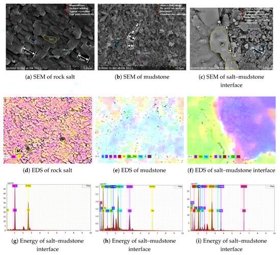 Table 1 presents the results of micro-energy-dispersive spectroscopy (EDS) analysis, revealing distinct elemental partitioning among rock salt, mudstone, and their interfacial zones. Rock salt is predominantly composed of Na and Cl, whereas Ca is the principal component in mudstone. At the salt–mudstone interface, Na and Cl remain dominant but exhibit reduced concentrations compared to pure rock salt. In contrast, Mg, Ca, and Si display intermediate concentrations, bridging the compositional differences between rock salt and mudstone.