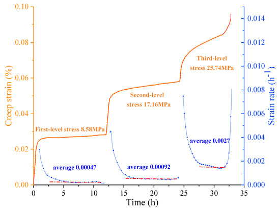 During the creep experiment, the strain–time relationship and field strain observations were recorded. The creep strain–time curve is presented in Figure 4. The experiment consisted of three creep loading stages, each displaying primary and steady-state creep phases, with accelerated creep deformation occurring during the third stage [41].