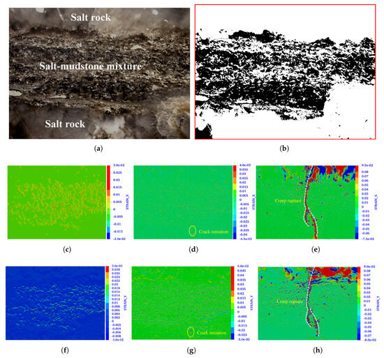 A comparison of Figure 6a,d,g indicates that no visible cracks formed during the first creep stage. However, crack initiation occurred within the rock salt in the second stage, with subsequent propagation into the salt–mudstone mixtures.