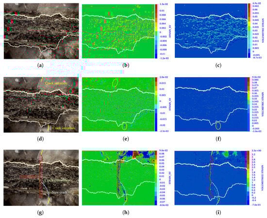 To analyze the evolution of the damage, tomographic images of a fixed zone D (as shown in image (iv) of Figure 1) during the first, second, and third creep stages are compared in Figure 6a,d,g, respectively. The variations in shear strain and volumetric strain (DIC results) within this observation zone, relative to the intact state, are presented in Figure 6b,e,h for shear strain and Figure 6c,f,i for volumetric strain. These results provide insights into the progression of damage.