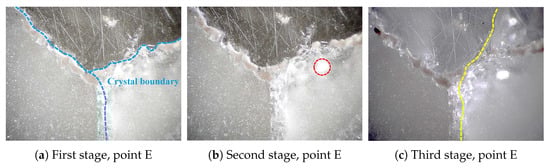 As discussed in Section 3.3.1, damage originates in the pure rock salt and propagates into the salt–mudstone interlayer. To investigate the mesostructural damage mechanisms during creep deformation, the structural evolution of pure salt (point E), the interlayer (point F), and the interface (point G), as marked in image (iv) of Figure 1, is analyzed as follows.