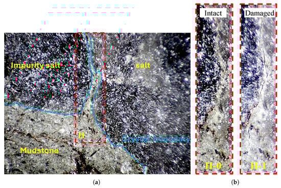Within the salt–mudstone interlayer, as shown in Figure 8, damage at point H is first observed during the second creep stage. Figure 8a presents a tomography image of the observation zone, revealing a mixture of salt grains, impure salt (containing minor impurities), and mudstone. Upon reaching the second stress level, crack initiation occurs at the boundary between the impure salt and mudstone. This behavior is consistent with the SEM tomography in Figure 3c, which shows pre-existing crack-like defects at the salt–mudstone interface that promote crack initiation [44].