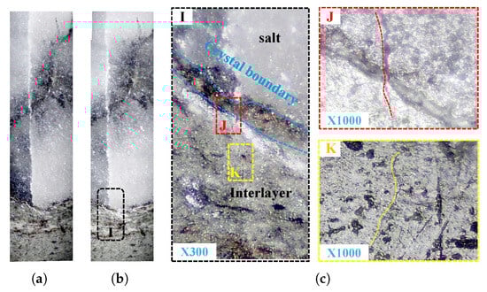 As seen in Figure 9a, an initial crack forms within a salt grain. By the third creep stage, as shown in Figure 9b, this crack propagates into the salt–mudstone interlayer. The magnified view in Figure 9c reveals that the crack primarily propagates through the mudstone grains, which aligns with observations in Figure 8b, highlighting the relatively low mechanical strength of mudstone.