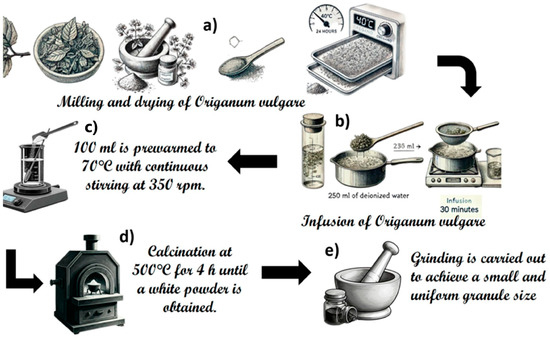 Experimental procedure to produce ZnO and ZnO/Ag. (a) The leaves of Origanum vulgare are milled and dried at 40 °C for 24 h. (b) An infusion is prepared by adding 250 mL of deionized water to the dried leaves, boiling for 30 min, and then filtering. (c) 100 mL of the infusion is heated to 70 °C with continuous stirring at 350 rpm, and Zinc acetate dihydrate and silver nitrate are added in different proportions as indicated in the text. (d) The resulting material is calcinated at 500 °C for 4 h until a white powder is obtained. (e) The final product is ground to achieve a small and uniform granule size.