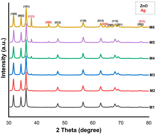 XRD patterns of the M1: ZnO, M2: ZnO/0.5%Ag, M3: ZnO/1%Ag, M4: ZnO/2%Ag, M5: ZnO/3%Ag, and M6: ZnO/6%Ag to sample system.