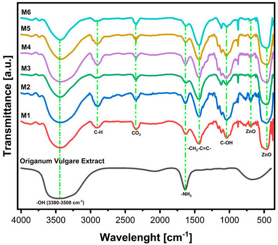 FT−IR spectroscopy of Origanum vulgare infusion and M1: ZnO, M2: ZnO/0.5%Ag, M3: ZnO/1%Ag, M4: ZnO/2%Ag, M5: ZnO/3%Ag, and M6: ZnO/8%Ag.