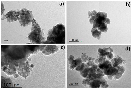 TEM analysis confirmed the presence of spherical, quasi-spherical, and agglomerated structures. As observed, the increase in the percentage of Ag in M4, M5, and M6 promotes larger agglomerates, reducing nanoparticle dispersion. The change in morphology is attributed to the increasing Ag content, which enhances particle agglomeration.