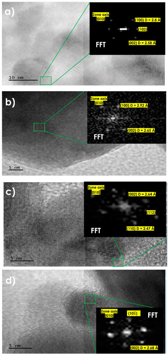 HRTEM analysis was performed to understand the behavior of the heterostructure of Ag formed by M1 to M6, in addition to ZnO. In Figure 6a, the HRTEM analysis shows a [010] zone axis, ZnO nano-spheres, and the (100) planes with an interplanar distance of 2.8 Å, and the (002) plane with an interplanar distance of 2.58 Å, along with a resultant plane (102), corresponding to the hexagonal phase of ZnO exhibiting the monocrystalline nature of M1 belonging to ZnO’s wurtzite, in the radial axis, indicating a growth direction [0002] for the ZnO nano-sphere. In the HRTEM analysis of Figure 6b, the [010] zone axis is observed, along with the (100) and (002) planes, with interplanar distances of 2.92 Å and 2.65 Å, respectively. In Figure 6c, the HRTEM and Fast Fourier Transform (FFT) analysis show the (002) and (110) planes, with an interplanar distance of 2.64 Å and 2.47 Å, respectively, and a resultant vector (112). Finally, in Figure 6d, the () and (002) planes are shown, with an interplanar distance of 2.68 Å for the (002) plane, along with a resultant plane (101), corresponding to the hexagonal cell of ZnO.