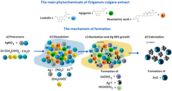 According to Tu Uyen Doan Thi and collaborators, organic components such as flavonoids and carotenoids are responsible for acting as ligand agents [19]. Based on the results obtained in this research, Figure 7 presents the reaction mechanisms for the formation of ZnO and Ag, highlighting the nucleation-growth process influenced by temperature and the composition of the extract. This process is driven by the main phytochemicals in Origanum vulgare extract, such as luteolin, apigenin, and rosmarinic acid, which consist of aromatic rings with hydroxyl groups that form ligand complexes. The precursors AgNO3 and Zn(CH3COO)2·2H2O dissolve in the Origanum vulgare extract, providing electrons through their flavonoids, playing a crucial role as reducing agents and stabilizers during the reduction of silver ions (Ag+) to metallic silver (Ag0) (Figure 7a,b). This leads to the nucleation and growth of Ag nanoparticles at 70 °C, promoting the formation of clusters or metallic Ag nanoparticles, driven by the phytochemicals in the extract with antioxidant properties that stabilize the formed nanoparticles. During the reduction of Ag+, a color change was observed in the colloid from pale yellow, indicating the formation of Ag nanoparticles. This change is attributed to the alteration of the optical properties of the nanostructures [30]. Additionally, it enhances the formation of Zn(OH)2 (Figure 7c). Subsequently, through a calcination process at 500 °C, the formation of ZnO nanoparticles is favored (Figure 7d), as the resulting solution mixture decomposes at temperatures up to 400 °C [27]. This leads to the reactions outlined in Equations (1) and (2).