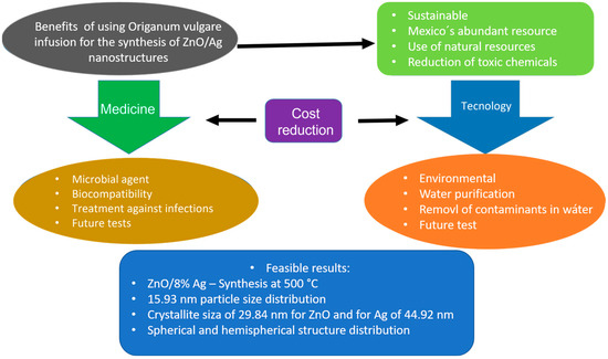 Finally, considering that Mexico is the second-largest global producer of Origanum vulgare, this study highlights the local availability of this resource, increasing the feasibility of this approach as an economical and sustainable option for synthesizing ZnO-Ag nanostructures in both research and industrial settings.