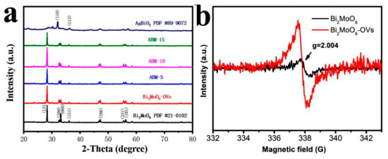 (a) XRD patterns of the standard diffraction card of as-synthesized samples, (b) EPR spectra of Bi2MoO6 and Bi2MoO6-OVs.