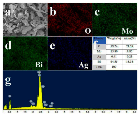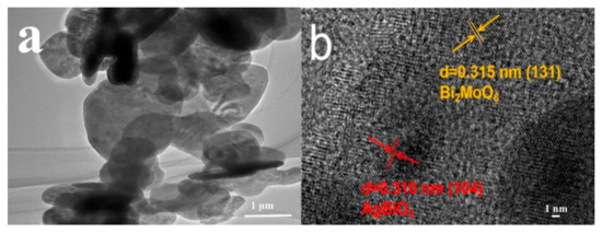 The ABM-10 heterojunction was further investigated by TEM and HRTEM. As revealed in Figure 3a, sheet-like AgBiO3 and Bi2MoO6 were both clearly observed with a diameter of around 1–3 µm and they interlocked with each other in the ABM-10 heterojunction. In Figure 3b, lattice spacing of 0.315 nm and 0.310 nm corresponded to the (131) plane of Bi2MoO6 and the (104) plane of AgBiO3, respectively, which further confirmed the formation of AgBiO3/Bi2MoO6 heterojunction. Simultaneously, the elements Bi, O, Mo, and Ag were all probed on the surface of AgBiO3/Bi2MoO6 heterojunction (Figure 4).